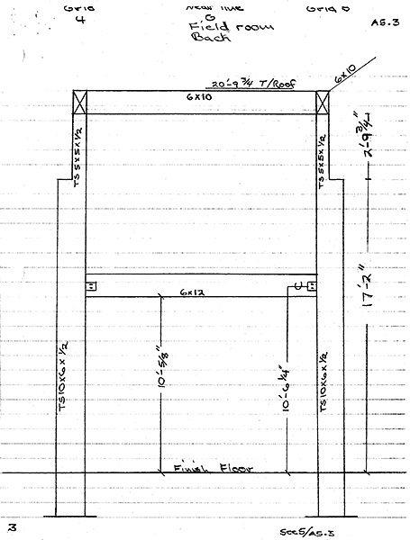 This is the second drawing done of the Tube Steel columns in the back of the Field Room. This drawing shows the exact elevation of the steel columns above finish floor and the elevation of the wood beam connections that must be welded onto the columns in the fabrication shop. This drawing references page A5.3 of the Architectural plan. The dimension from finish floor to the bottom of the base plate of the Tube Steel columns is 40-1/2".