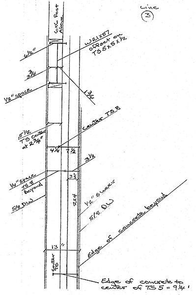 This is the first drawing done to locate the Tube Steel columns in the back of the Field Room. To locate the steel columns in the foundation, first one must locate the framed walls, sheer panel and drywall in relationship to the foundation and then locate the steel columns within those parameters. Notice that every material used to construct the wall has an exact dimension and location in relationship to the foundation dimension of 17'-6".