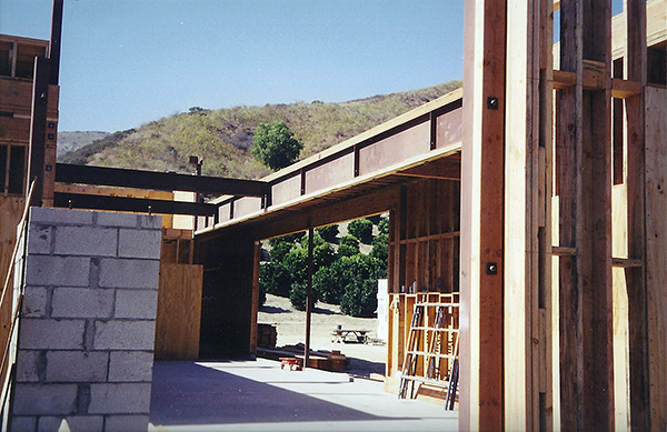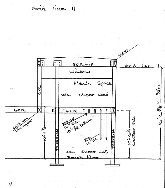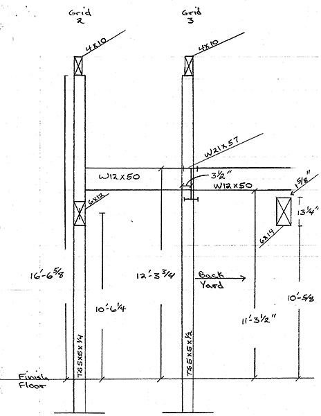 This picture taken during framing shows W12x50 beams attached to the W21x57 beam. The right side of the W21x57 beam is in the ceiling soffit area between the W21x57 and the exterior 6x12 header. The 3x and 4x wood members attached to the Tube Steel columns and beams are shown.