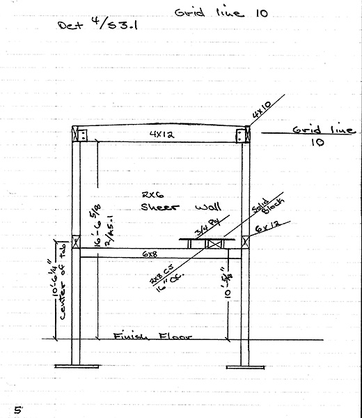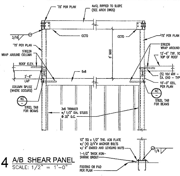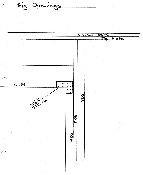 This was a typical large opening on the home. Structural Detail 6 on page S3.2 was similar. Large glass openings have a lot of wind shear. I prefer to have a 2x King Stud so we can face nail the header. The extra 4x6 behind the King Stud runs from the bottom plate thru to the Top plate and gives the 12' high wall and large opening a lot of extra strength. On windy days the 4x6 behind the 2x6 King Stud will stop the wall from shaking and wobbling. A lot of preconstruction is just common sense and the plans and drawings are what ties everyone working on the project together. All these decisions must to be made in preconstruction because the 4x6 post also has a hold down attached to it with a concrete embedded bolt that must be set in the formwork before the foundation is poured and before the framing begins. "Plan the build and build the plan."