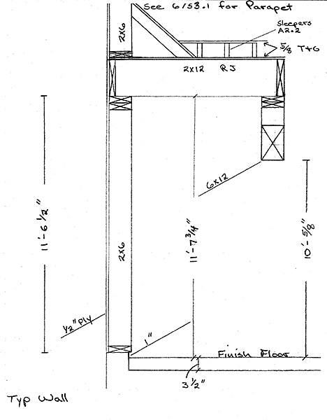 This preconstruction elevation drawing was done to show a cut section through a typical exterior wall with dimensions and elevations.